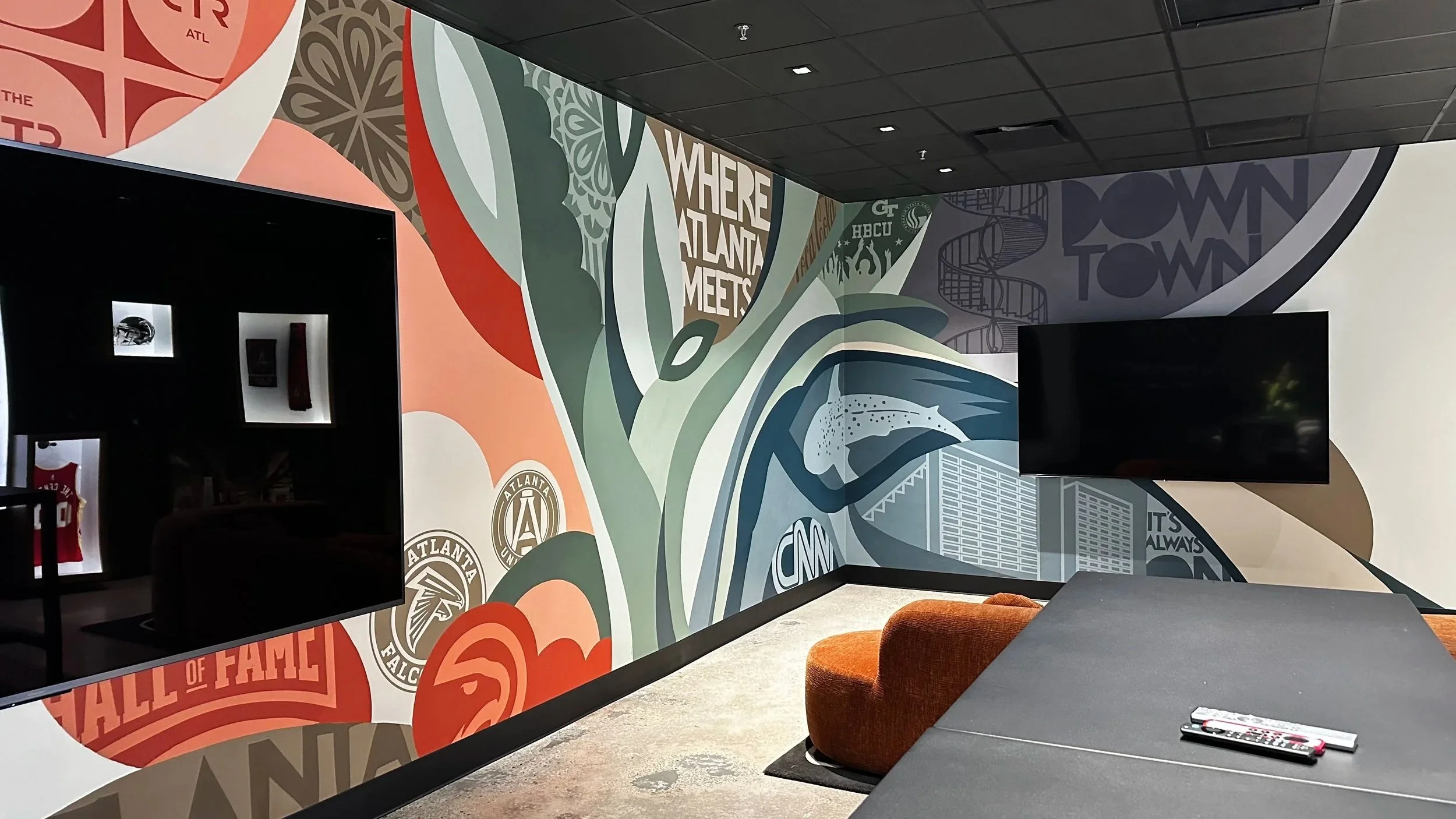 I created the artwork in Adobe Illustrator and Procreate. I treated the wall like a map of Atlanta energy. The mural stretches across the room and wraps the corner. Curved shapes carry your eye from one side to the other.